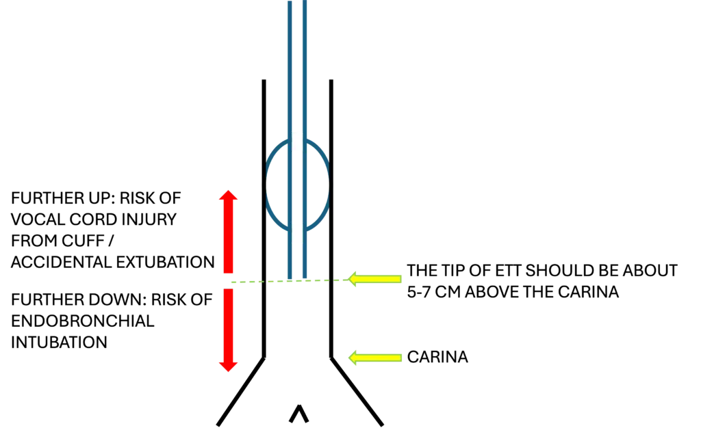 The optimal position of ETT can be assessed with CXR. The idea is that you want the tip to be just in between the carina and the vocal cord. Most sources recommend to position the tip of the ETT about 5-7 cm from the carina. Although personally, I try not go higher than 5 cm.