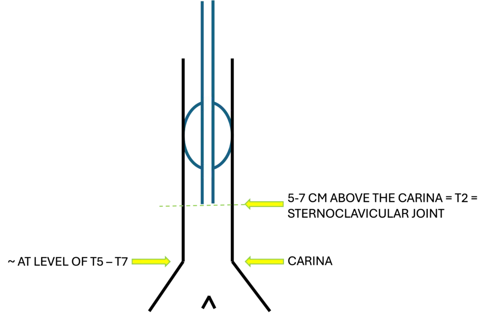 In some cases when you can’t see the carina clearly from the CXR, you can use the vertebral body as a guide. The carina is at approximately at the level of T5 – T7. 5 cm from level of T5 is at the level of T2 which is correlates to the level of sternoclavicular joint.